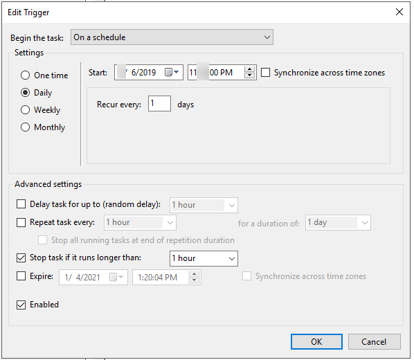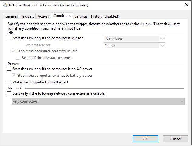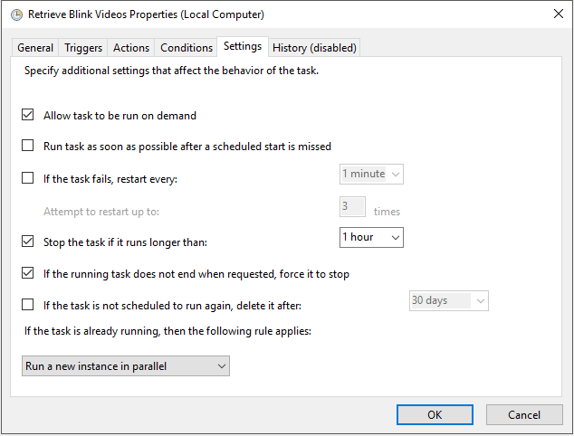 Adding a scheduled task is easy and is a consistent way in which you can retrieve the files without intervention. While I won’t go into detail, I will post some screenshots of how I have the scheduled task setup.