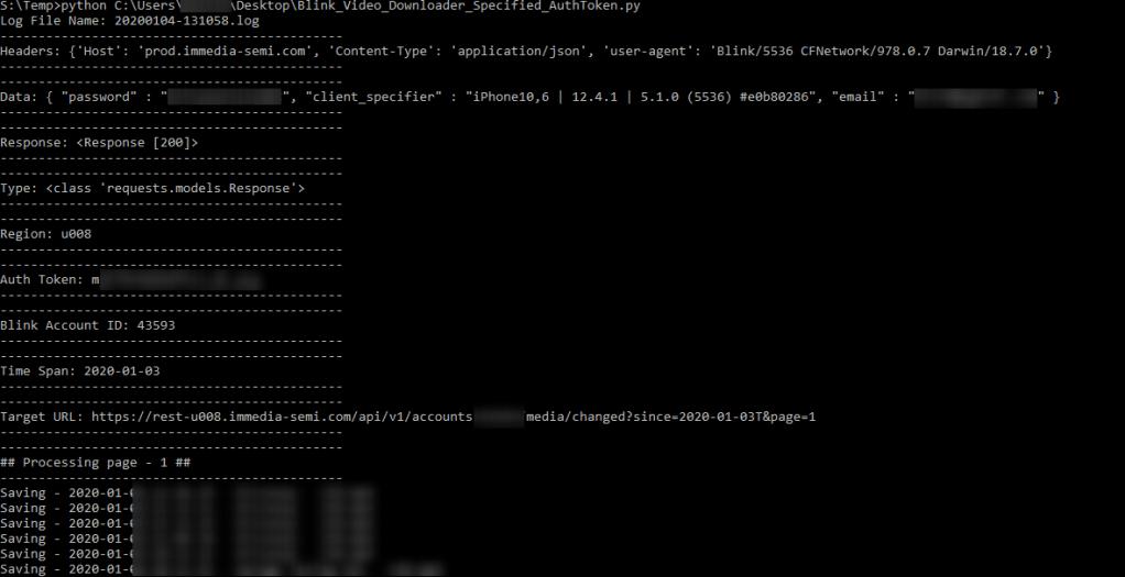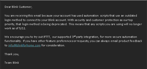 In May 2020, the Blink Team sent an email indicating that the scripts leveraged in this blog post/GitHub are using an outdated method for authentication. I have confirmed that the as-implemented method is no longer functional. If time permits or demand is high enough, I will work on incorporating functional changes.